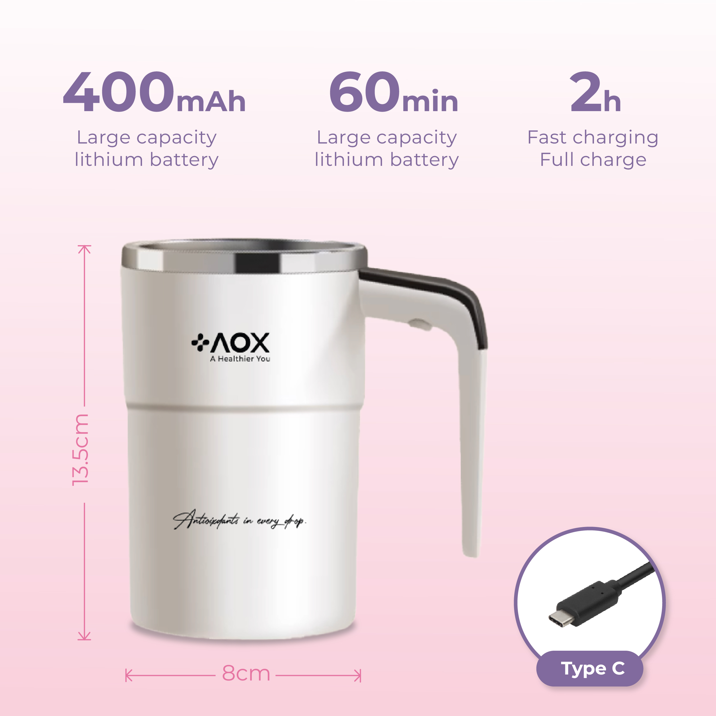 • Features: Rechargeable, Portable, Magnetic Mixer, Temperature Display, Stainless Steel and Food-Safe PP Material