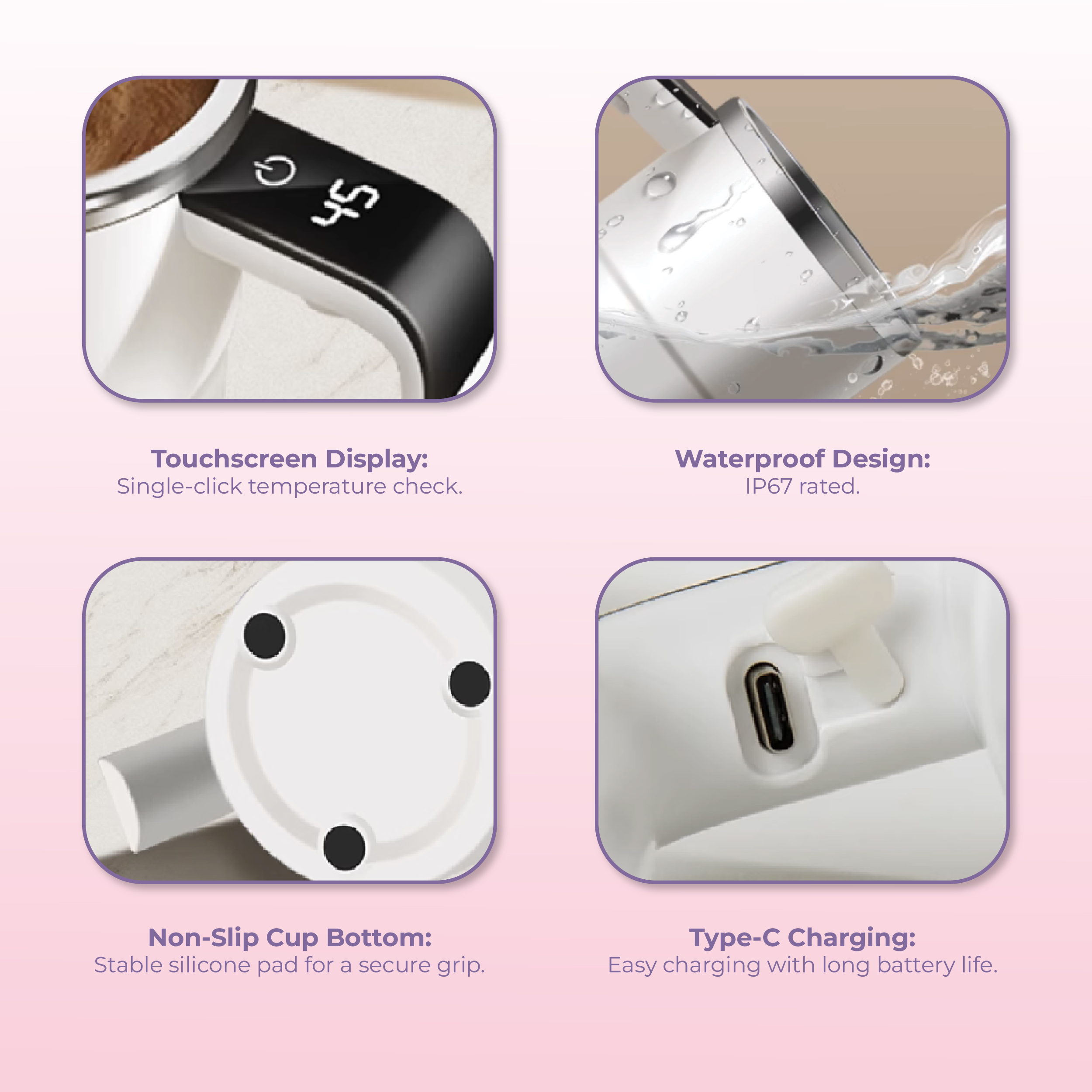 • The built-in temperature sensor shows the drink’s temperature, helping you enjoy it at the ideal warmth without scalding or cooling too much.